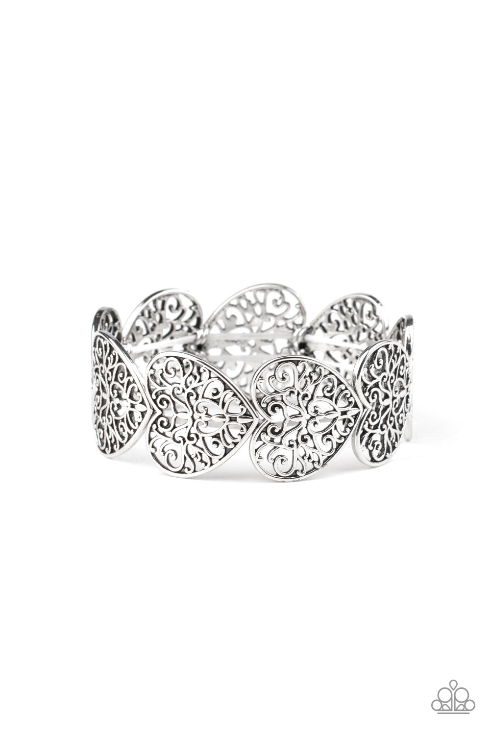 Filled with vine-like filigree, an antiqued collection of silver heart frames are delicately threaded along stretchy bands around the wrist for a romantically vintage look.