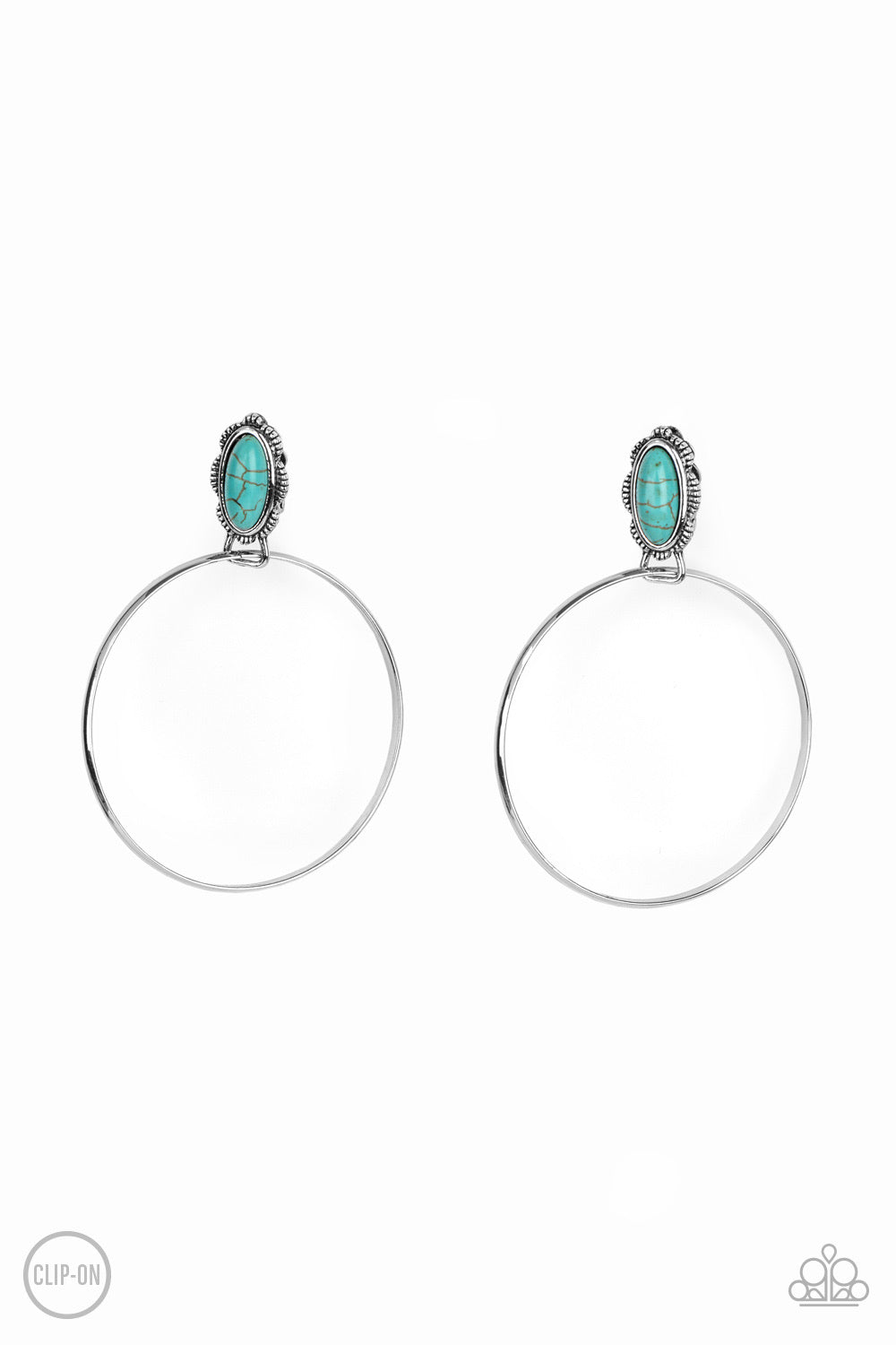 A shimmery silver hoop is threaded through the bottom fitting of an earthy turquoise stone dotted floral silver frame, creating a whimsical display. Earring attaches to a standard clip-on fitting.
