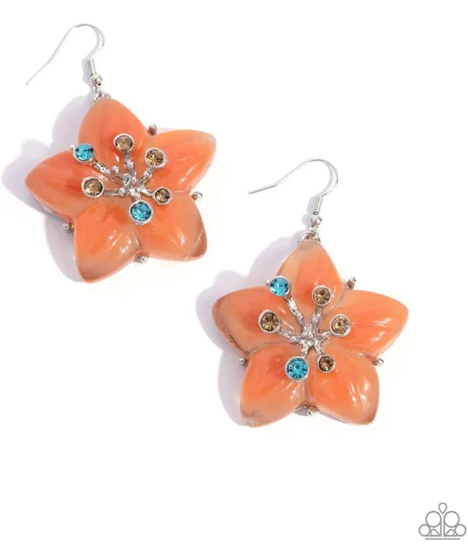 Blooming from an abstract silver-studded center, a collection of aquamarine and light peach rhinestones glitters while a glassy orange flower frames the shimmer for additional color and whimsy. Earring attaches to a standard fishhook fitting.