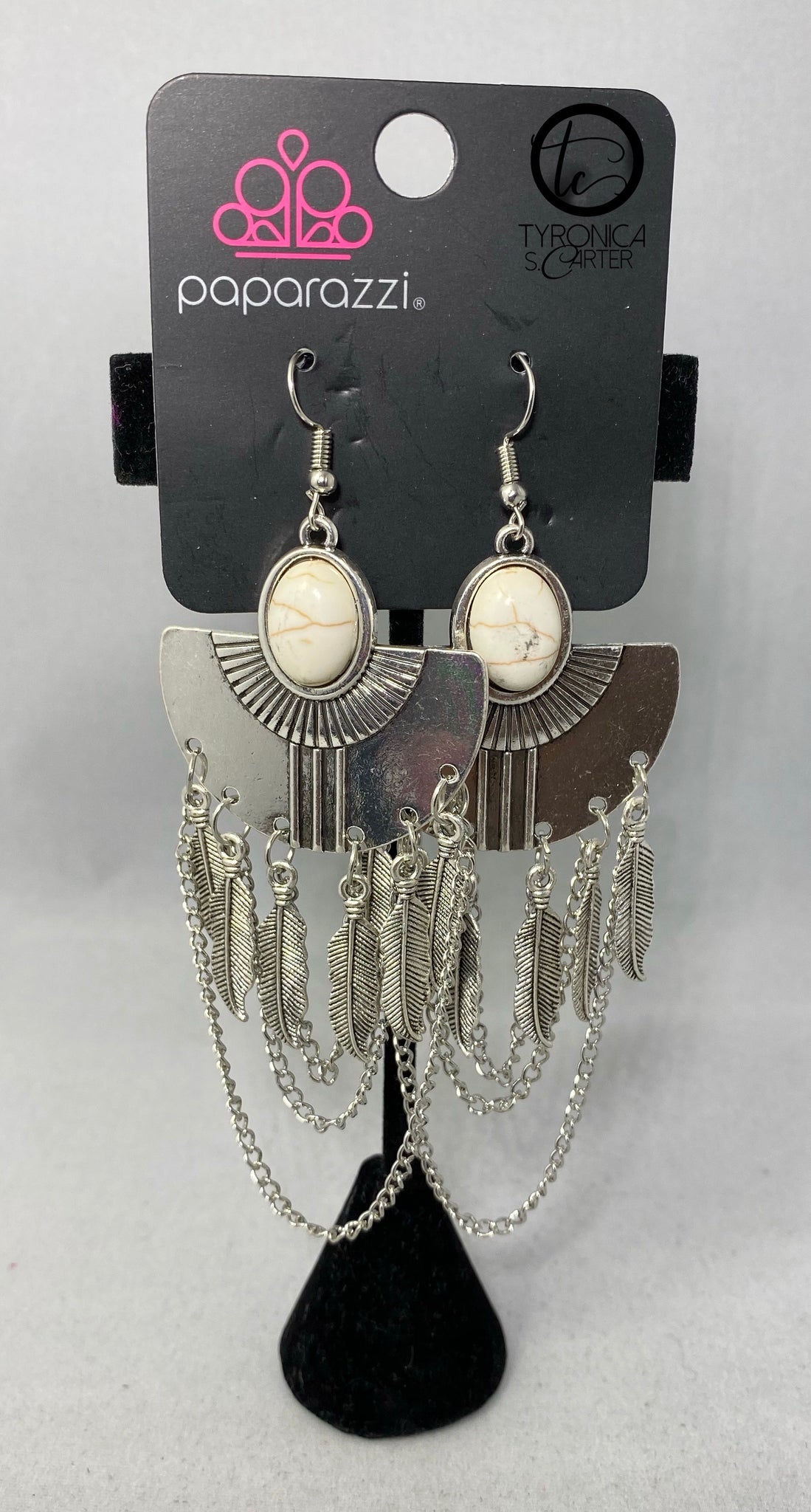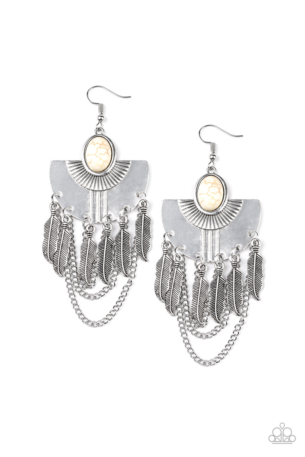 A fringe of antiqued silver feathers and shimmery silver chains dangle from the bottom of a fanning silver frame dotted with a smooth white stone for an earthy finish. Earring attaches to a standard fishhook fitting.