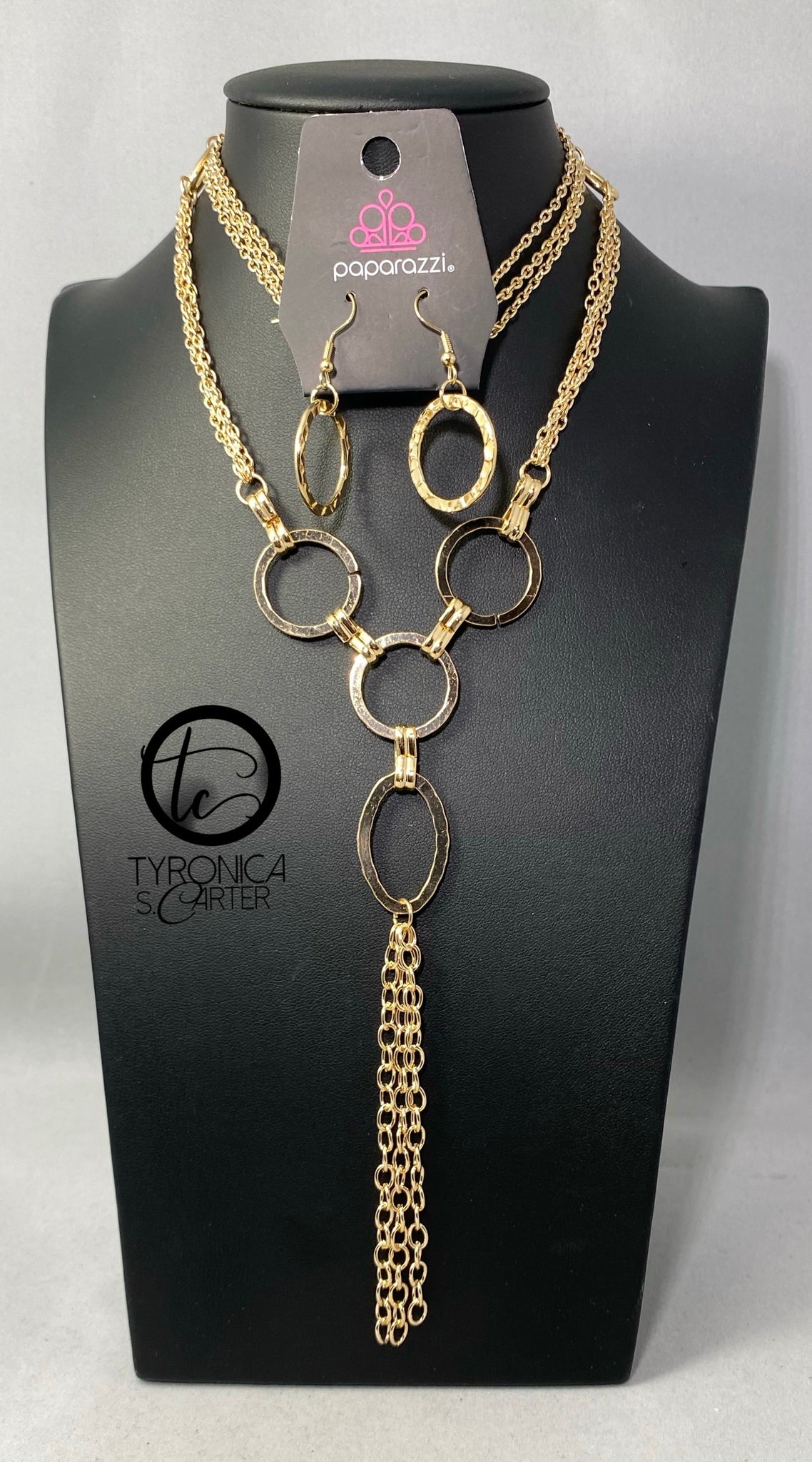 Hammered gold rings and ovals link into an industrial style pendant at the bottom of shimmery sections of gold chains. Classic gold chains stream from the bottom of the display, adding edgy movement. Features an adjustable clasp closure.