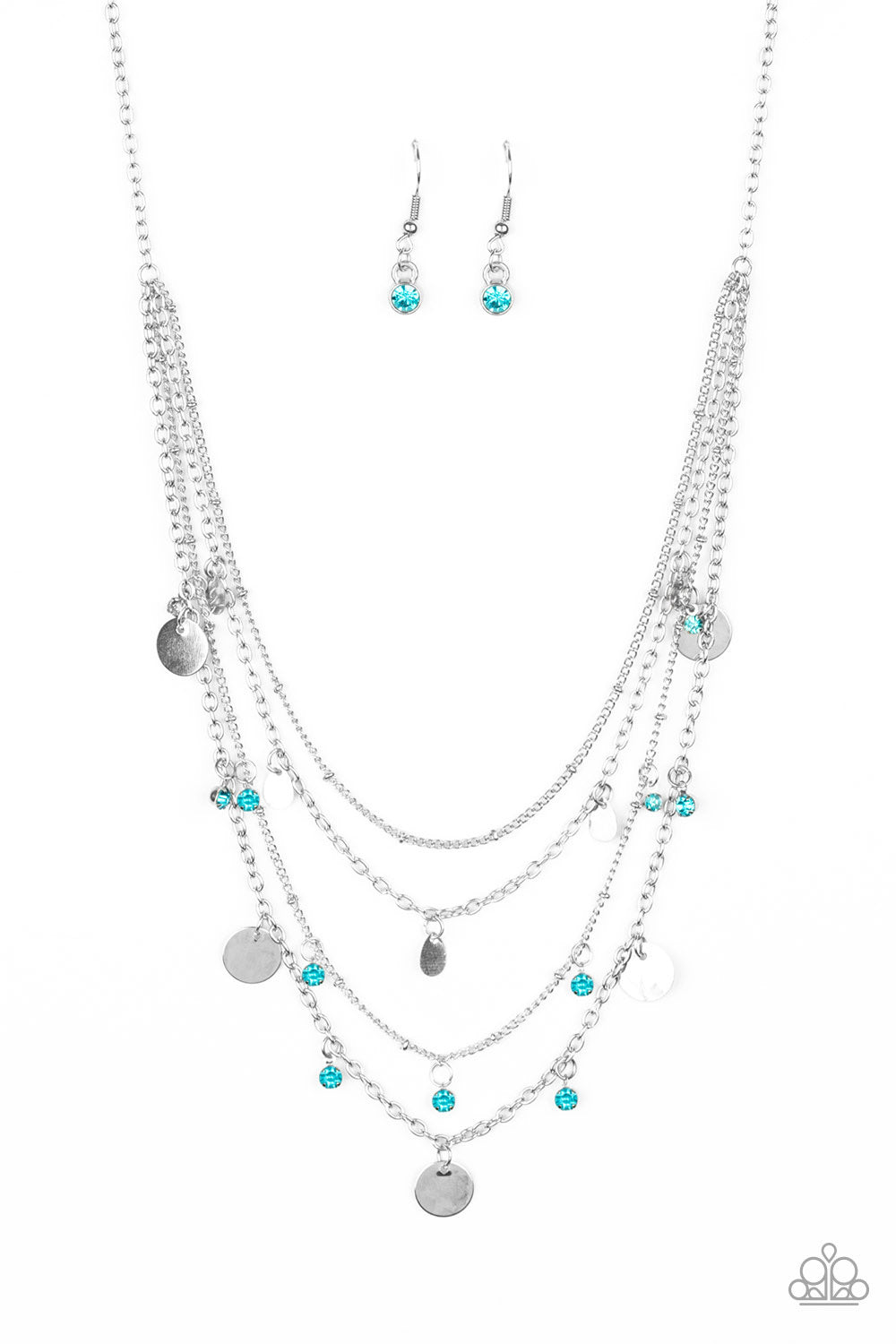 Dainty blue rhinestones, flat silver teardrops, and glistening silver discs trickle from mismatched silver chains below the collar for a refined look. Features an adjustable clasp closure.