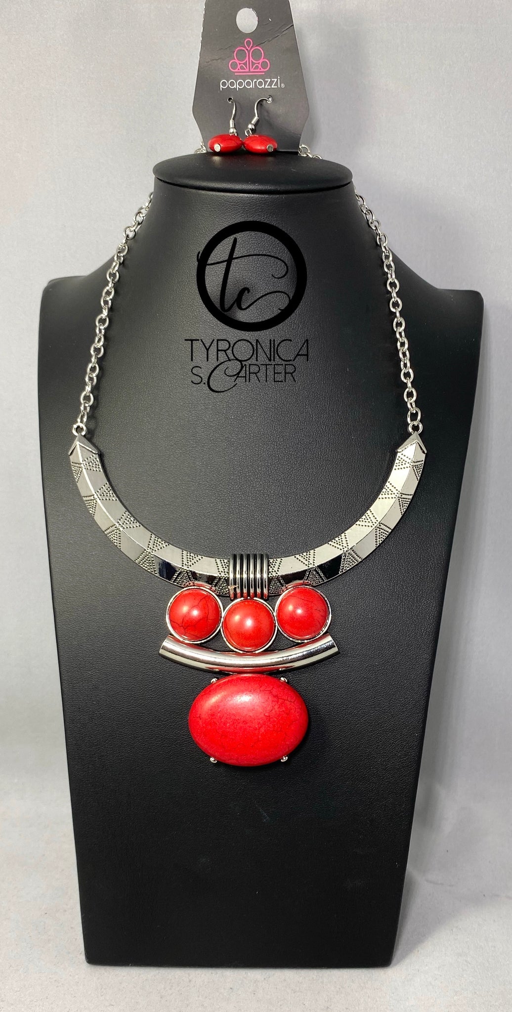 Oversized red stone accents alternate with mismatched silver frames, coalescing into a dramatic tribal inspired pendant below the collar. Features an adjustable clasp closure.
