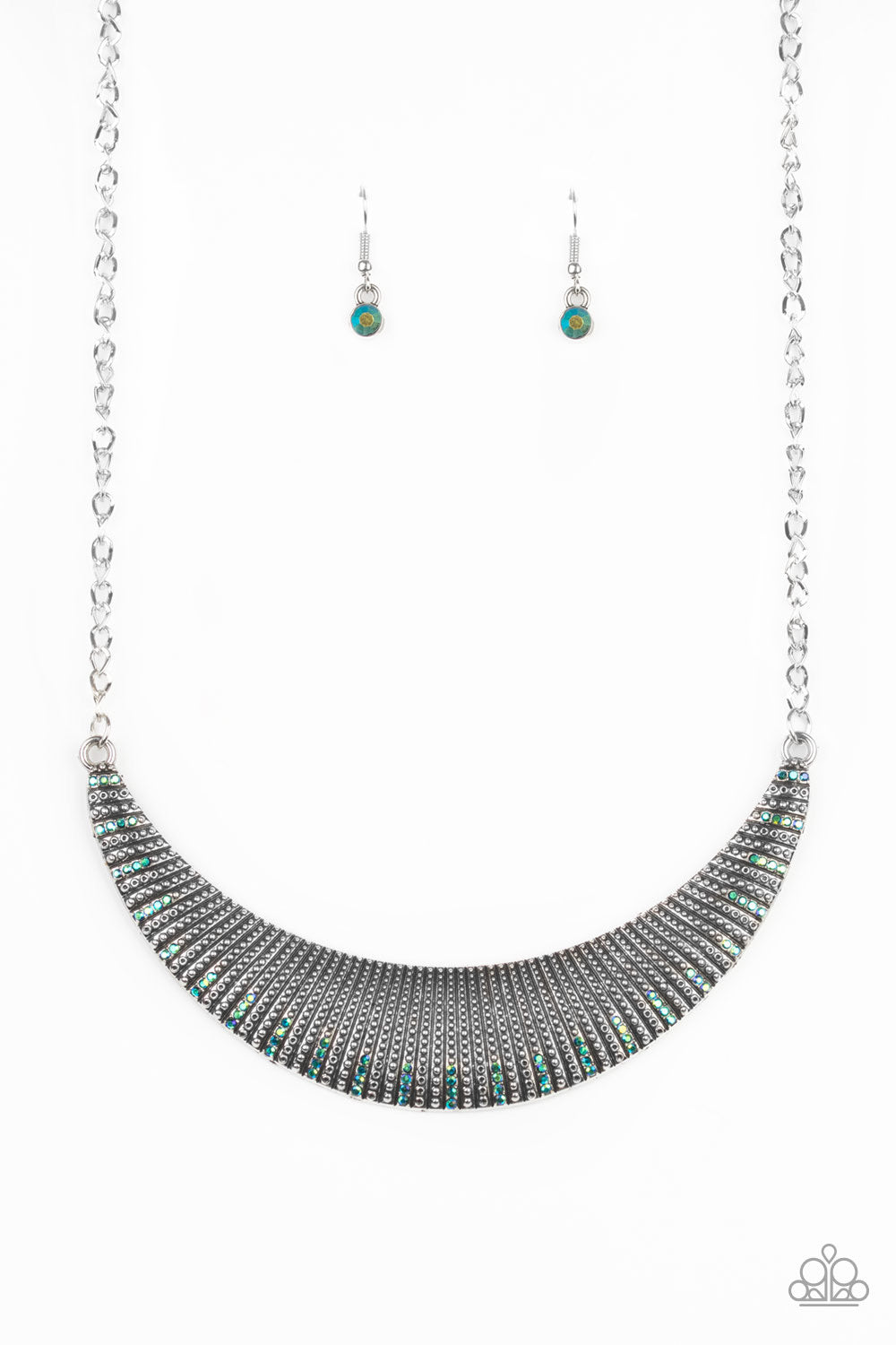 Studded in row after row of linear textures, the bottom of an oversized silver half-moon pendant is encrusted in sections of dainty iridescent rhinestones for an edgy shimmer below the collar. Features an adjustable clasp closure.