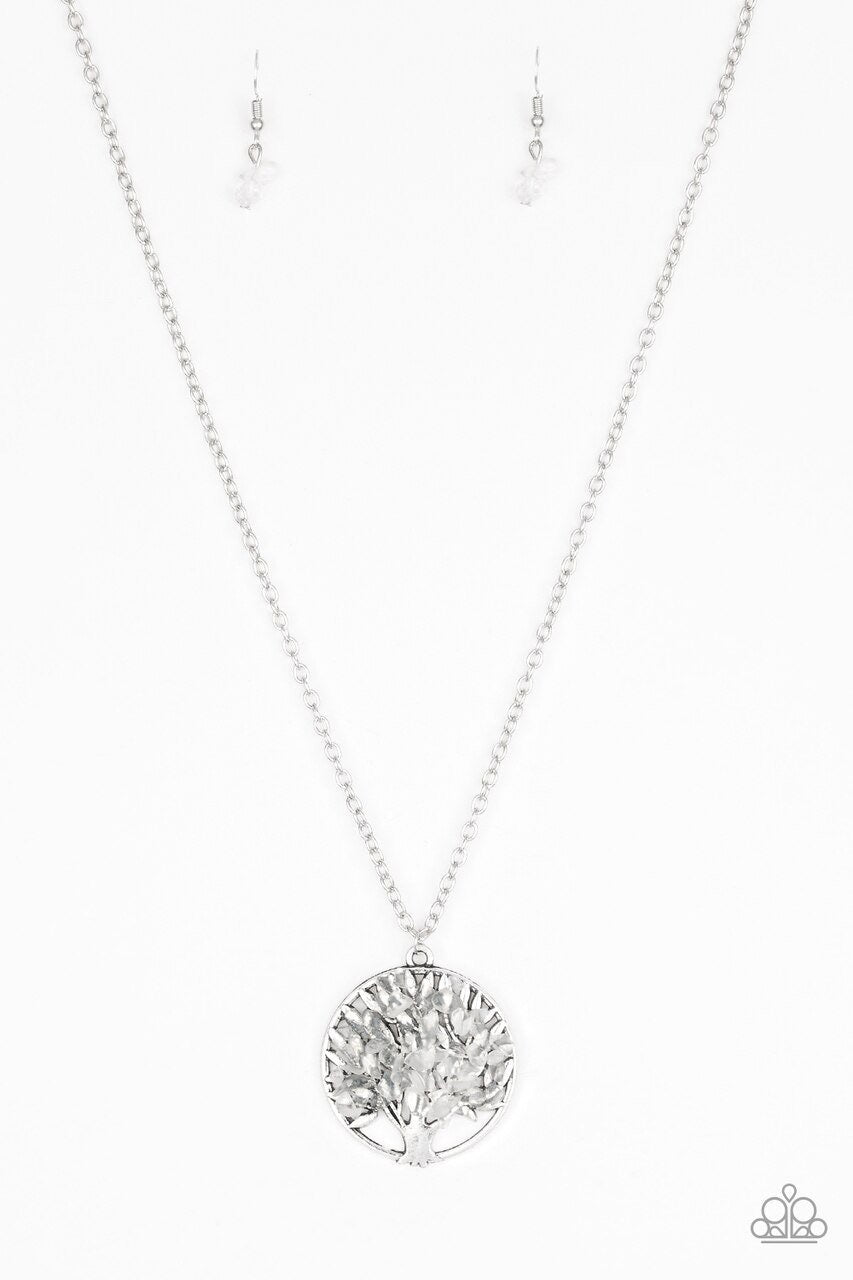 Bits of white rock are sprinkled along a shimmery silver tree pendant, creating colorful leaves. Features an adjustable clasp closure.