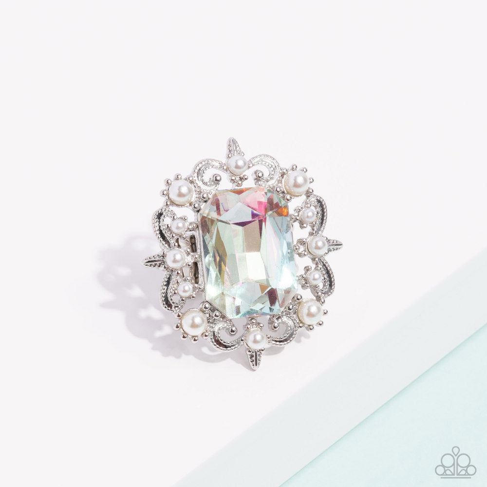 Pressed into an airy, whimsical, silver filigree frame, dotted with glossy white pearls, an emerald-cut purple UV shimmery gem creates a fairy tale-inspired centerpiece atop the finger. Features a stretchy band for a flexible fit.
