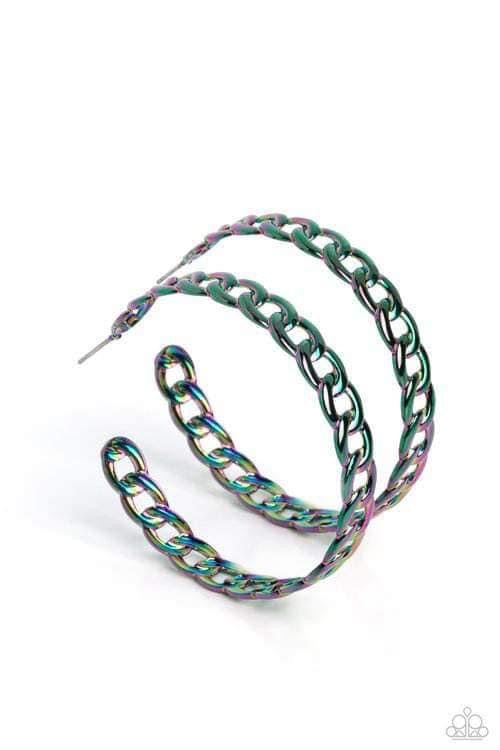 Featuring an oil spill shade, a curb chain delicately curves into a stellar hoop at the ear for a geometric finish. Earring attaches to a standard post fitting. Hoop measures approximately 2" in diameter. Due to its prismatic palette, color may vary.
