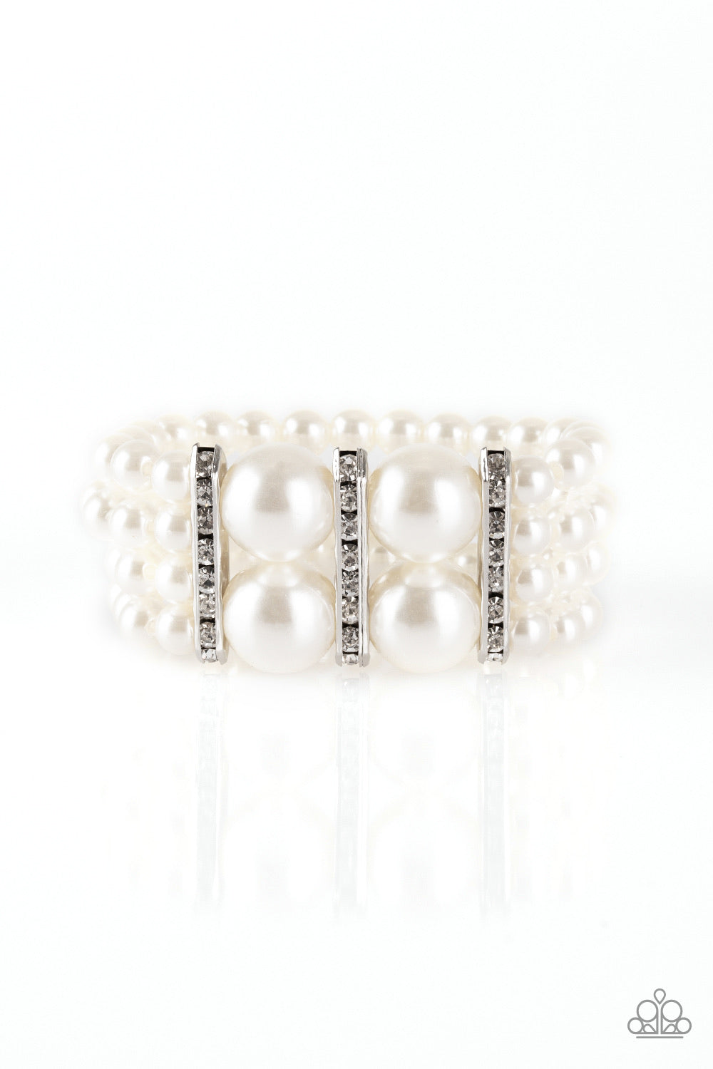 Strands of timeless white pearls are threaded along stretchy elastic bands and joined together by white rhinestone encrusted frames. The glittery frames combine with oversized pearls at the center, adding a dramatic twist to the classic pearl palette.
