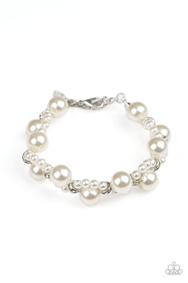 Threaded along invisible wires, a strand of classic white pearls delicately weaves with a strand of dainty white pearls and white rhinestone encrusted rings around the wrist for a timeless twist. Features an adjustable clasp closure.