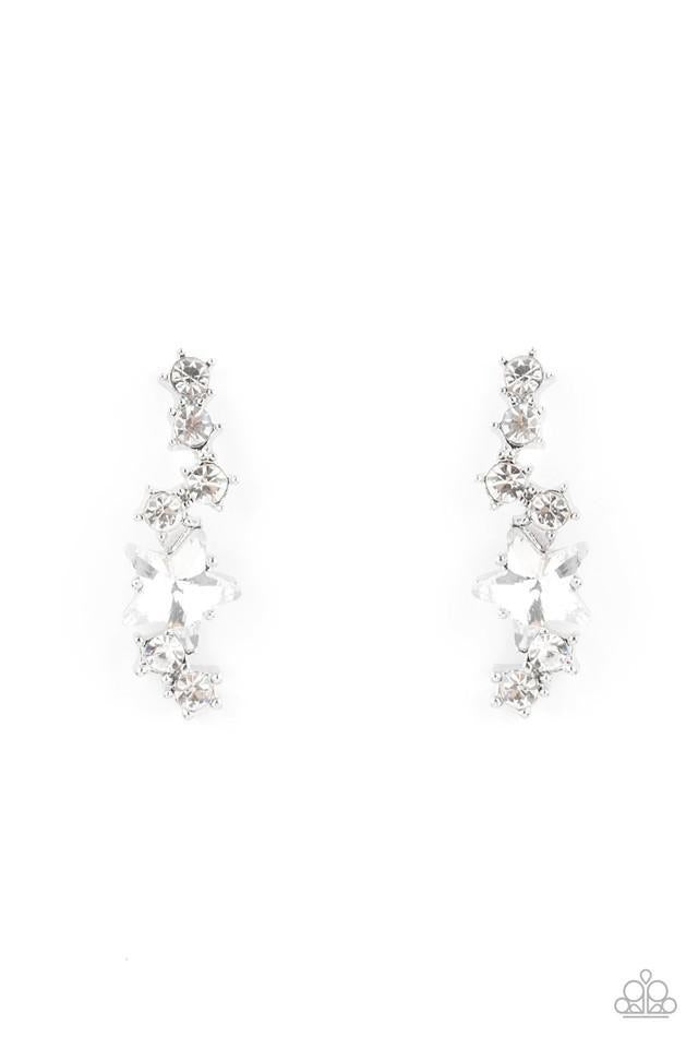 A star shaped white rhinestone and glassy collection of dainty white rhinestones climb the ear, creating a stunningly stellar centerpiece. Earring attaches to a standard post fitting.