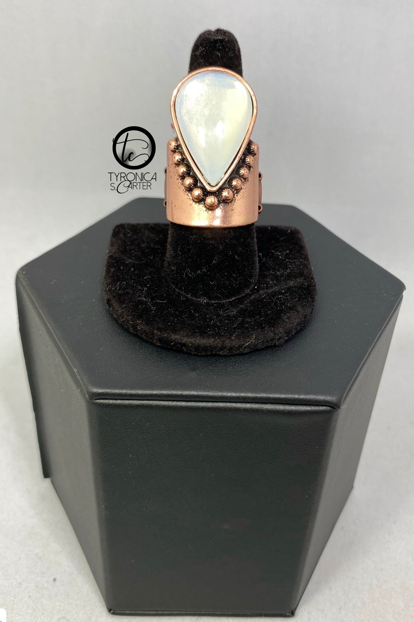 Featuring a milky iridescence, the tip of a glassy white teardrop attaches to a studded copper band. The bottom of the ethereal teardrop drips down, creating a bold, one-of-a-kind statement piece. Features a stretchy band for a flexible fit.