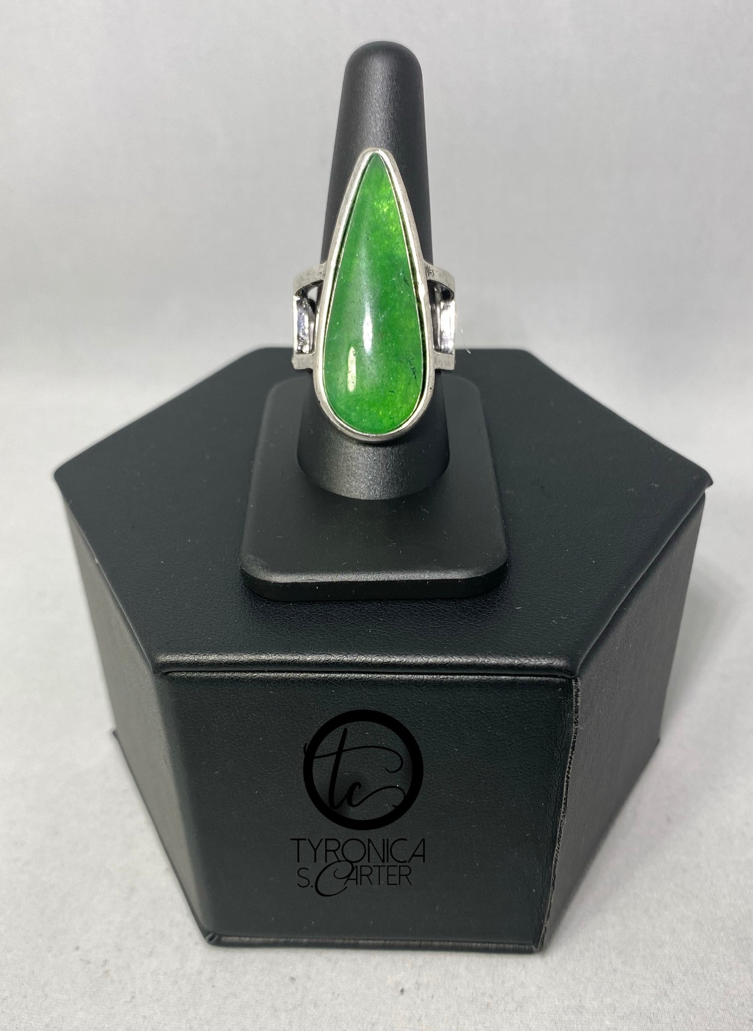 An elongated green stone teardrop is pressed into a sleek silver frame atop the finger, creating a mystical centerpiece. Features a dainty stretchy band for a flexible fit.