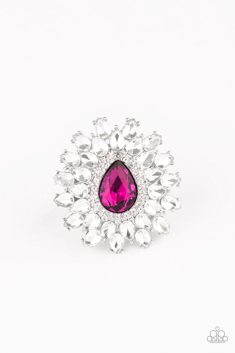 White teardrop petals fan out from a dramatic pink teardrop rhinestone center, stacking into a glamorous centerpiece atop the finger. Features a stretchy band for a flexible fit.