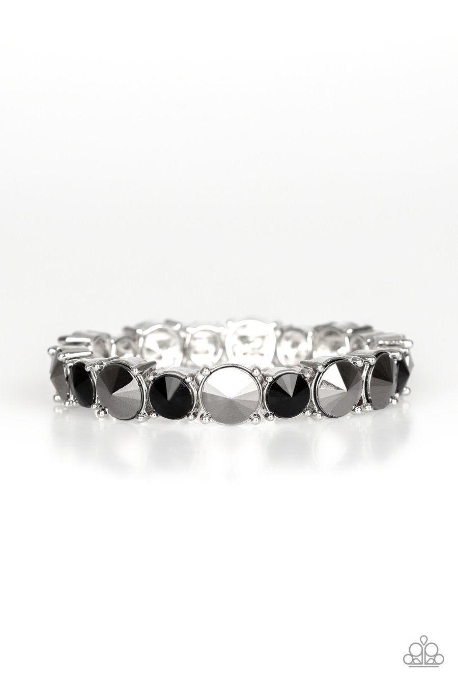An assortment of over sized black and hematite rhinestones are pressed into sleek square frames and threaded along stretchy bands, creating a blinding sparkle around the wrist.