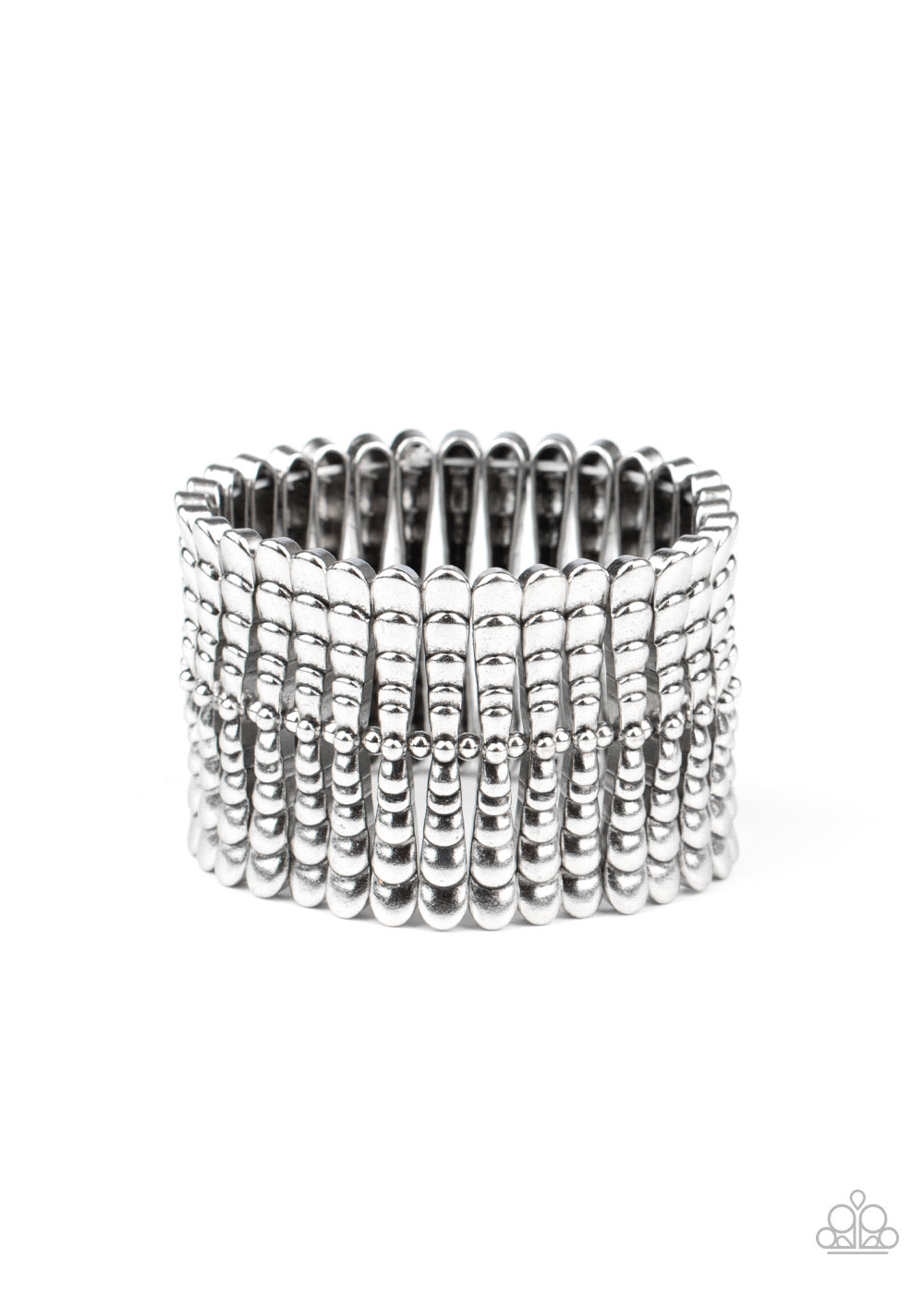 Infused with dainty silver beads, rippling silver bars are threaded along stretchy bands around the wrist, creating a rustic centerpiece.