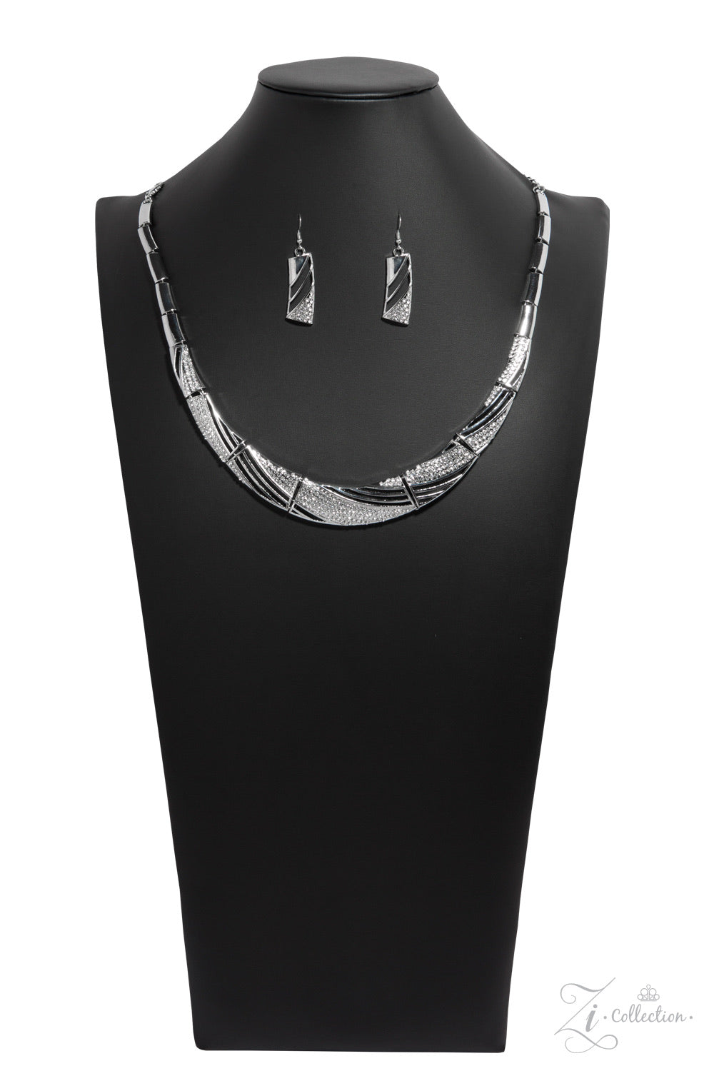 Varying in size and shimmer, a set of three individual silver plates connect to form a solid collar. Ribbons of blinding white rhinestones decorate each piece, adding rich, sparkling accents to the design. The centermost plate is stenciled in airy detail, allowing the skin to peek beneath the frame for a fearless finish. Features an adjustable clasp closure.
